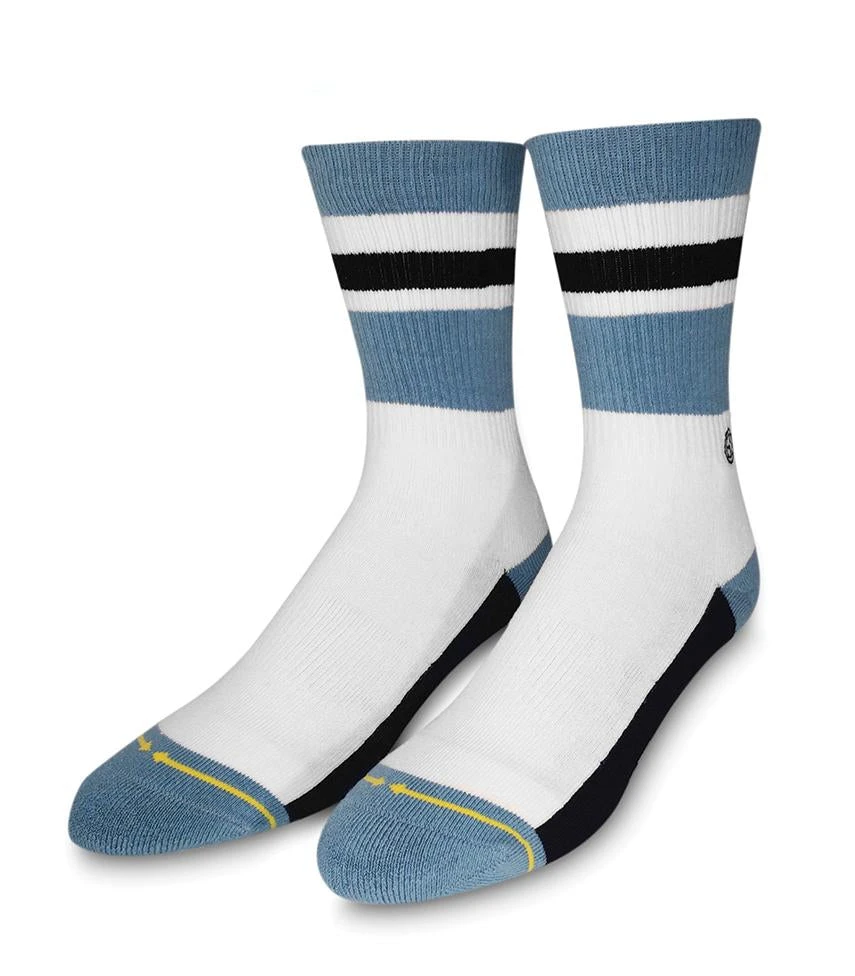 Look how much it costs for a cup of coffee. Do you hear that ringing noise? That is your future ailing, and it is saying and grab a pair of these awesome crew socks for men. They’ll go with almost everything! A classic white crew sock with blue and black stripes, plus MERGE4’s signature yellow arrows.