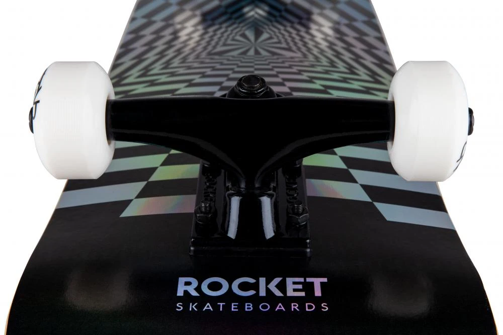 Rocket Prism Foil Silver Skateboard measuring in at 7.75″ wide. These boards come with a 7 ply Hardrock Maple Deck with a foil finish, 5.25’’ Black trucks, 52mm wheels and abec 5 bearings.