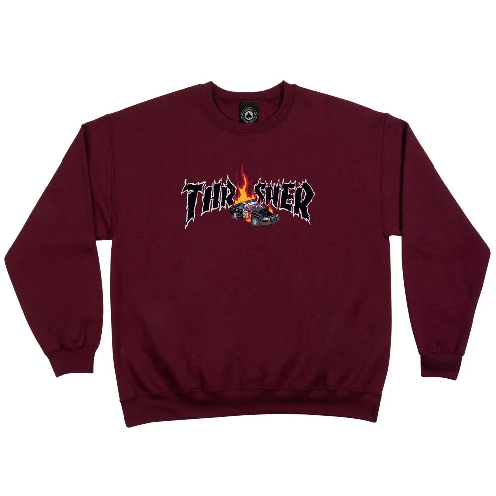 This is the Thrasher Cop Car Crew in Maroon. Midweight, 50% cotton 50% polyester crewneck featuring Neckface original artwork.