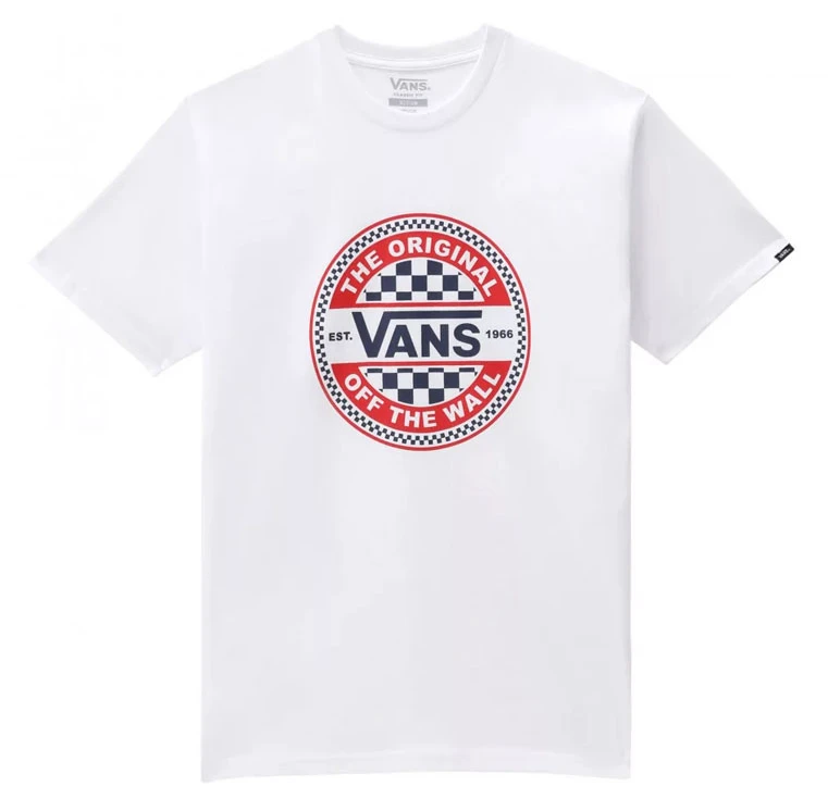 The Vans Circle Checker T-Shirt in White is a heavier weight 100% carded ringspun cotton tee with short sleeves and checkered circle graphics at the left chest and back.